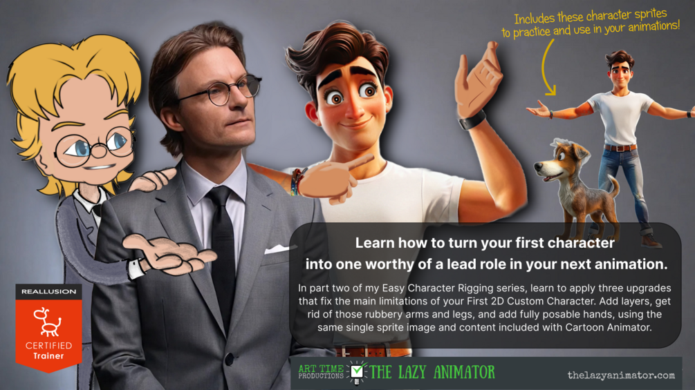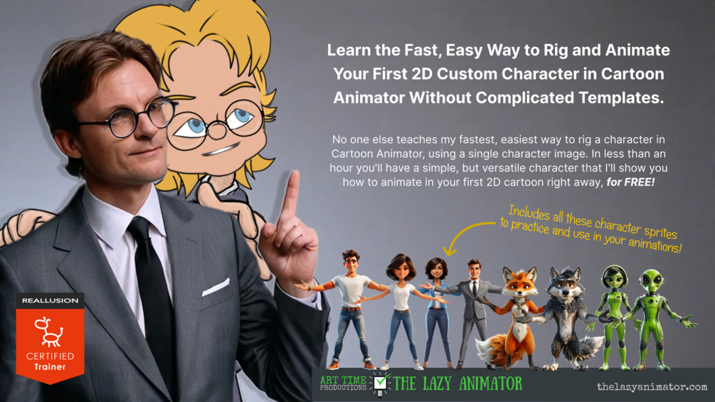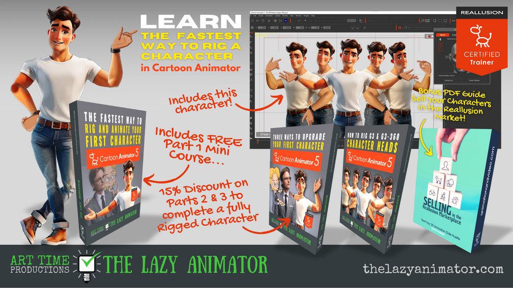 Includes ALL THREE parts. Once you've made your first character with my FREE Fastest Way to Rig a Character in Cartoon Animator mini course, take your character all the way to stardom with Three Ways to Upgrade Your First Character and How to Rig G3 and G3-360 Character Heads.